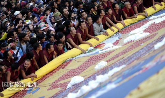 國(guó)家旅游地理 西藏拉薩8月6日訊 8月6日,拉薩哲蚌寺舉行展佛儀式。當(dāng)日,以西藏最大的格魯派寺廟哲蚌寺展佛為開(kāi)端的雪頓節(jié)在拉薩拉開(kāi)序幕。每年藏歷六月底七月初是西藏傳統(tǒng)的節(jié)日“雪頓節(jié)”。在藏語(yǔ)中,“雪”是酸奶子的意思,“頓”是“吃”“宴”的意思,“雪頓節(jié)”按藏語(yǔ)解釋就是吃酸奶子的節(jié)日,因此又叫“酸奶節(jié)”。因?yàn)?ldquo;雪頓節(jié)”期間有隆重?zé)崃业牟貞蜓莩龊鸵?guī)模盛大的曬佛儀式,所以有人也稱之為“藏戲節(jié)”“曬佛節(jié)”。 /新華社記者 普布扎西攝