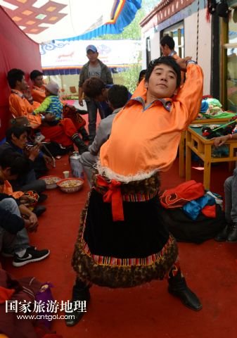 8月6日,在西藏堆龍德慶縣乃瓊鎮(zhèn)甲熱村舉行的雪頓節(jié)曬佛慶典上,甲熱村覺(jué)木隆藏戲團(tuán)的演員們?nèi)雸?chǎng)表演。