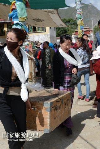 國(guó)家旅游地理 西藏拉薩8月9日訊 8月6日,在西藏堆龍德慶縣乃瓊鎮(zhèn)甲熱村,覺(jué)木隆藏戲團(tuán)團(tuán)長(zhǎng)瓊達(dá)(前右)在演出后和團(tuán)員一起搬運(yùn)道具。藏戲是藏族人民喜聞樂(lè)見(jiàn)的藝術(shù)形式,而發(fā)源于甲熱村(舊稱覺(jué)木隆)的覺(jué)木隆藏戲在藏戲各流派中流傳最廣。
