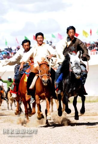國家旅游地理 西藏那曲8月10日訊 8月10日,藏族牧民在進(jìn)行跑馬比賽。當(dāng)日,一年一度的藏北“恰青”賽馬藝術(shù)旅游節(jié)開幕,牧民們相聚那曲賽馬場,載歌載舞慶祝豐收。 /新華社記者唐召明攝
