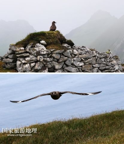 登上圣基爾達島并非易事,記者因風高浪大在外赫布里底群島等待多日才有船出海。僅可乘載10余人的小船在風浪中穿行了近3個小時,圣基爾達島終于出現(xiàn)在霧色籠罩的海面上。島上散落著十余座已經荒蕪破敗的石舍和幾百個儲物石室,這些殘存的遺跡早已成為野羊與海鳥的巢穴,人類反而成為外來的訪客。人類文明的消失為一些稀有的物種和瀕臨滅絕的鳥類提供了安全的棲息地。島上陡峭的山坡隨處可見野羊悠然漫步,而那些嶙峋的峭壁和海礁則棲息著數十萬只各類海鳥。世界上最大的塘鵝群——約6萬對塘鵝在這座海島及附近的海礁上繁衍生息。