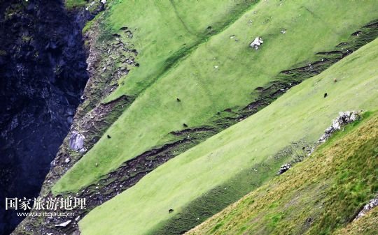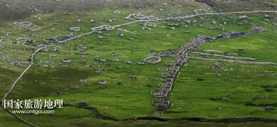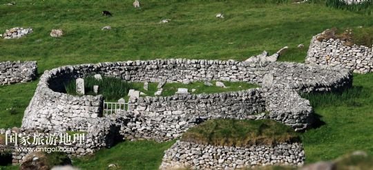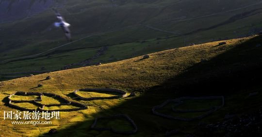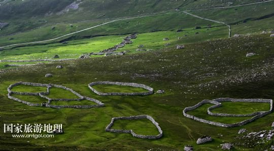 國家旅游地理 英國倫敦8月14日訊 在圣基爾達島已經遺棄的村落旁的山坡上,有用石頭圍墻圈起的一塊塊耕地。當年在島上定居的村民在這些石圈內鋪墊海藻,種植少量谷物。一個個形狀各異的石圈保護著這些寶貴的谷物免遭風暴與家畜的侵害(7月19日攝)。