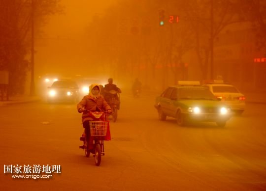 國家旅游地理 甘肅酒泉4月23日訊 4月23日,一輛拉載公路施工人員的三輪車在沙塵暴中行駛在酒泉市瓜州縣城郊的公路上。當(dāng)日,甘肅省酒泉市的敦煌市、瓜州縣等地遭受特強沙塵暴襲擊,最小能見度不足20米。當(dāng)日下午,酒泉市氣象臺發(fā)布沙塵暴紅色預(yù)警信號。 /新華社記者 聶建江 攝