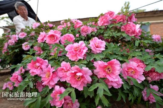 國(guó)家旅游地理 內(nèi)蒙古赤峰5月23日訊 5月22日在內(nèi)蒙古寧城縣長(zhǎng)皋村烏氏家族的庭院里拍攝的盛開(kāi)的牡丹花。在內(nèi)蒙古赤峰市寧城縣小城子鎮(zhèn)長(zhǎng)皋村,有一株300多歲“高齡”的牡丹成為當(dāng)?shù)匾痪啊T撝昴档ぶΩ呒s1.7米,直徑約3米,康熙年間作為皇家嫁妝移植至此,雖經(jīng)300余年的風(fēng)風(fēng)雨雨,如今仍不失國(guó)色天香,每年吸引大批游人前來(lái)觀賞。新華社發(fā)(白鐵軍 攝)