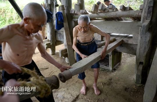 國(guó)家旅游地理 湖北恩施6月23日訊 6月21日,在湖北省宣恩縣箭竹坪村的榨油房里,“打榨佬”們揮舞撞錘猛擊楔子。紀(jì)錄片《舌尖上的中國(guó)》第二季熱播,讓片子中出現(xiàn)的手工榨油技藝進(jìn)入公眾的視野。在湖北西部山區(qū)恩施土家族苗族自治州宣恩縣李家河鄉(xiāng)箭竹坪村,依然留存有手工榨油的榨房及一批身懷絕技的手藝人。