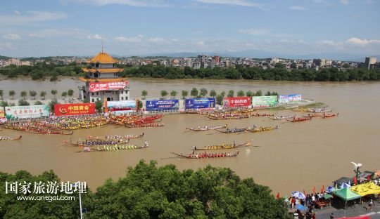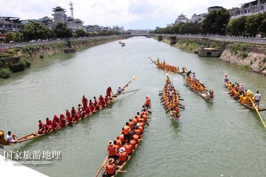 國家旅游地理 湖南永州6月16日訊 6月16日,參加道縣龍船賽的龍船在水面上角逐。