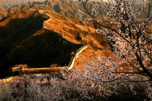 北京慕田峪長(zhǎng)城掩映在綻放的杏花中。新華社發(fā)(卜向東 攝)