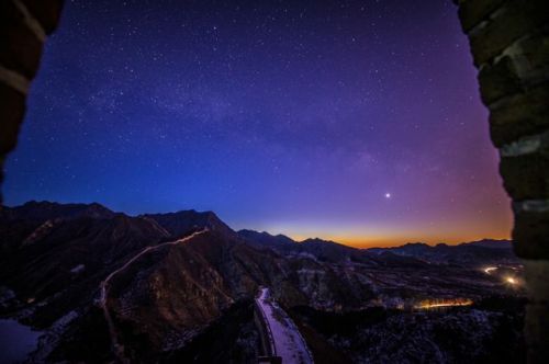 這是在北京懷柔黃花城長(zhǎng)城一座烽火臺(tái)上拍攝的日出前的星空。新華社記者楊光 攝