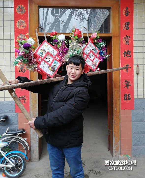 小伙子肩抬慶燈準(zhǔn)備去接“龍”。鄒善水 攝